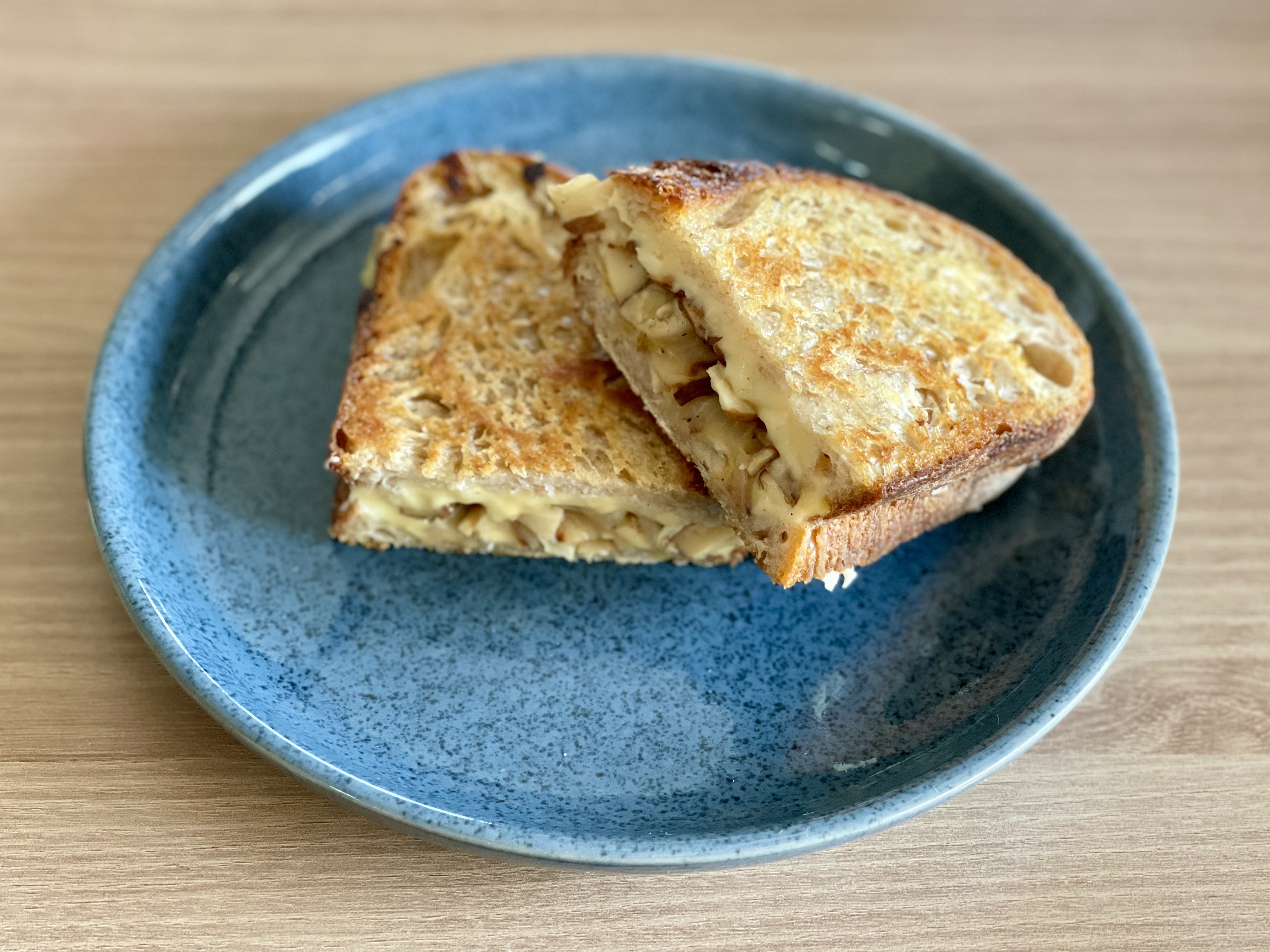 노릇노릇하게 구워진 사워도우 사이에, 향긋하게 볶아낸 버섯과 풍미가 좋은 스모크 치즈가 듬뿍 들어간 샌드위치였는데,