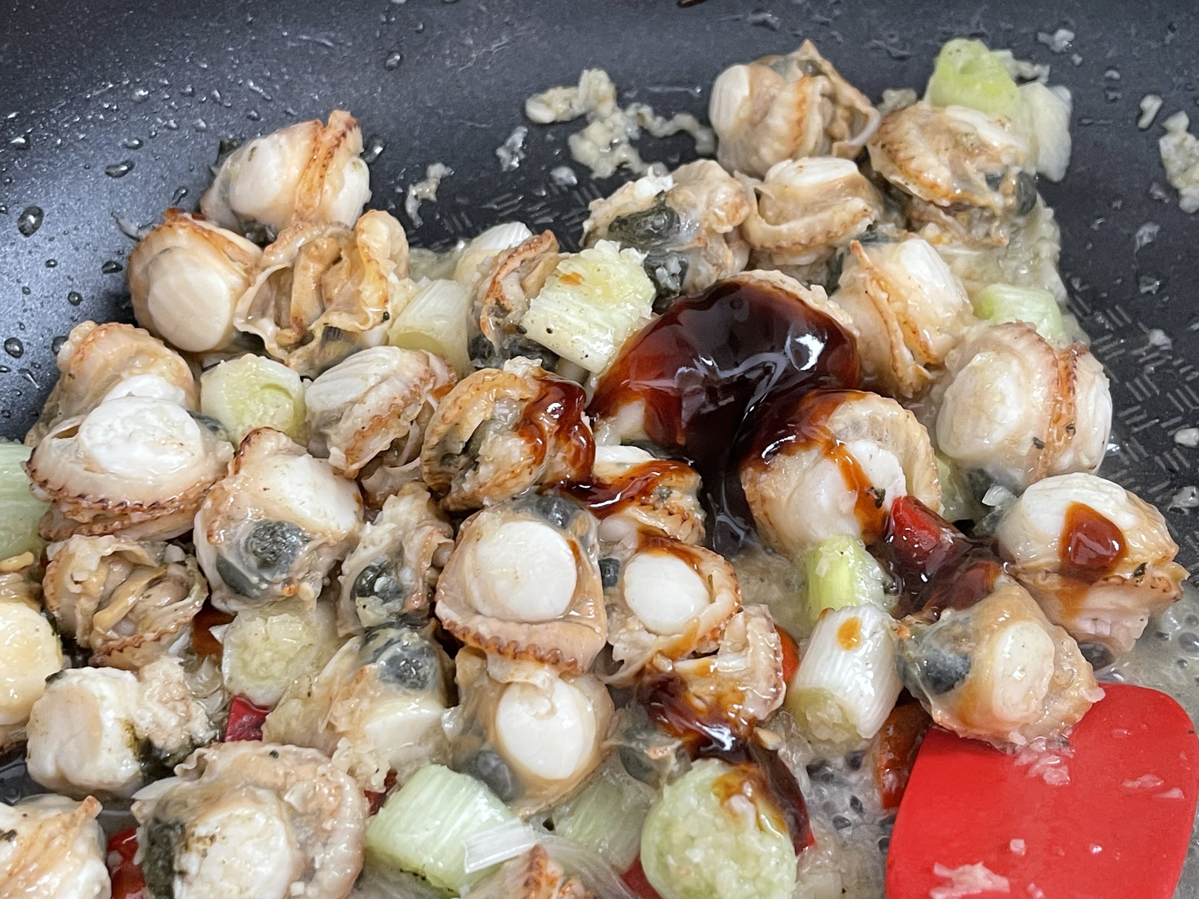 양념이 고루 섞이면 물 100ml 정도를 넣고 센 불에서 바글바글 끓여줍니다. 물이 너무 많으면 소스가 묽어지고, 너무 적으면 볶음이 뻑뻑해지니 양을 잘 조절해 주세요. 소스가 졸아들면서 가리비살과 채소에 진한 맛이 스며들게 됩니다.