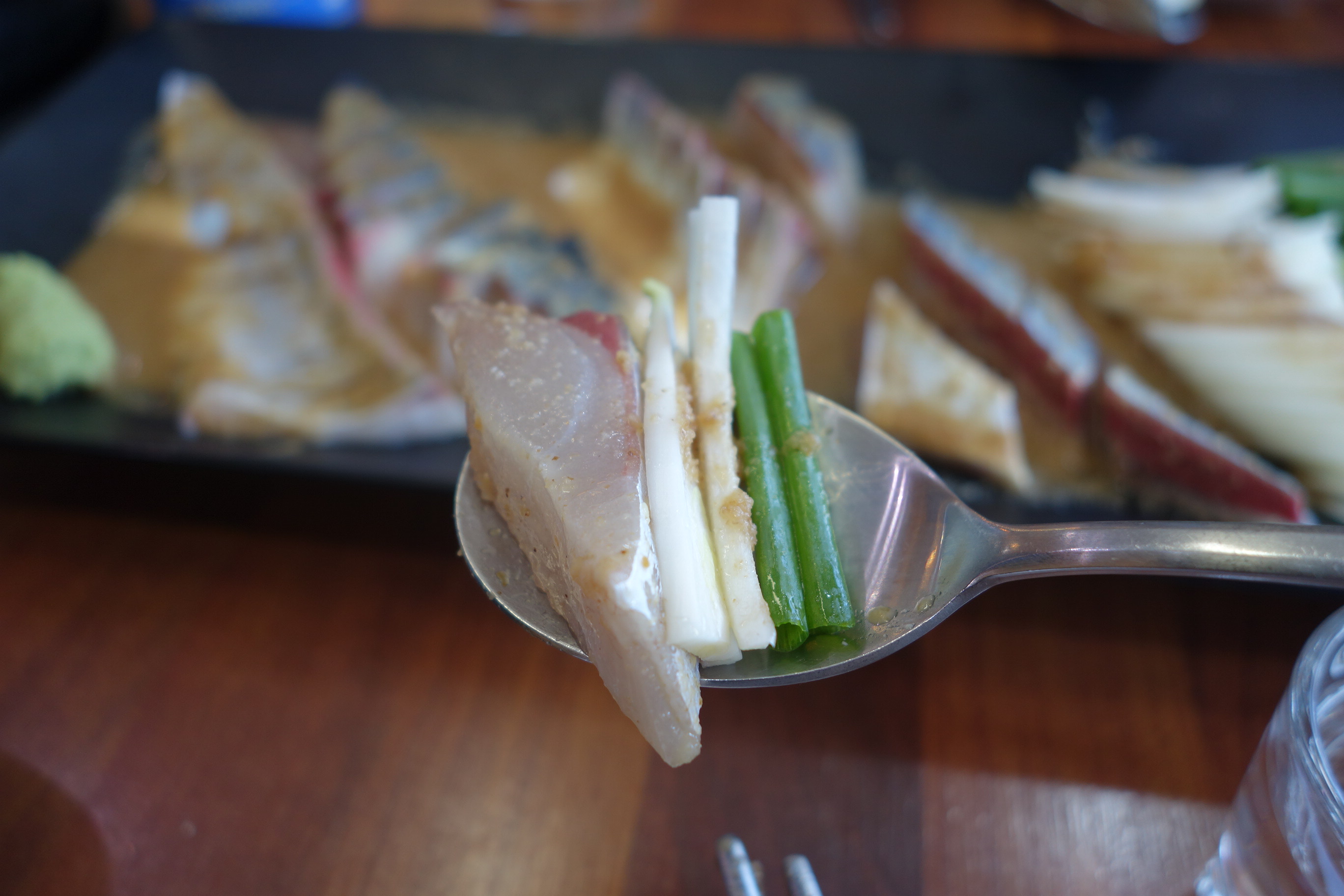 - 신선한 고등어 회를 달콤한 간장 베이스의 특제 소스에 담근 후, 참깨(고마, ごま)와 쪽파 등의 양념을 듬뿍 얹어 먹는 방식입니다.
